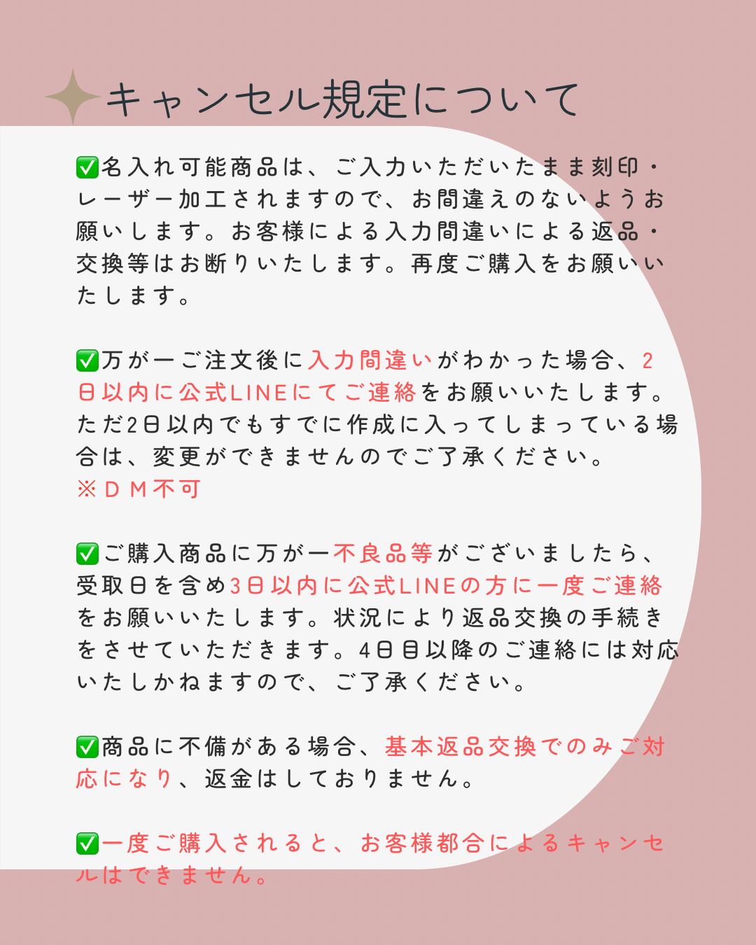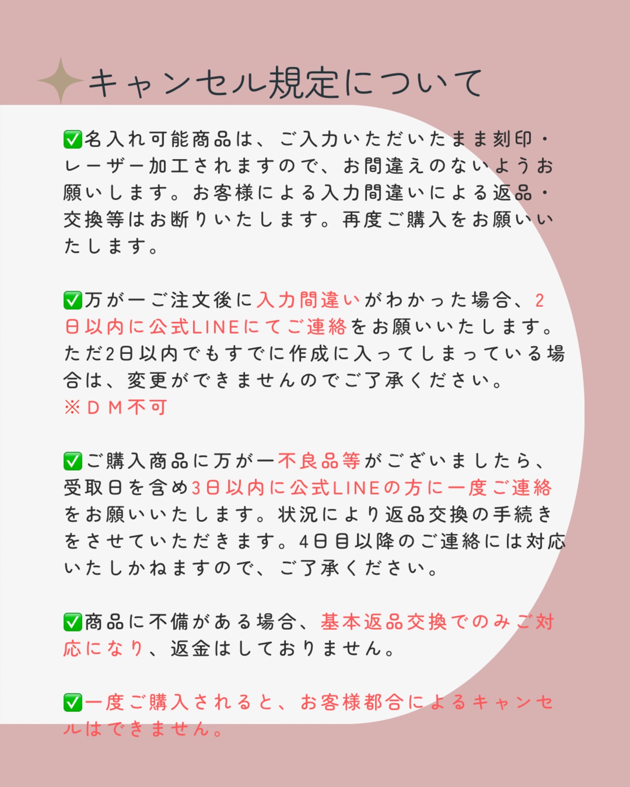 ・お手元に届いた商品に不備等がございましたら、届いた日を含め3日以内にお写真とともに一度公式LINEの方までご連絡をお願いします。4日目以降のご連絡は対応できません。